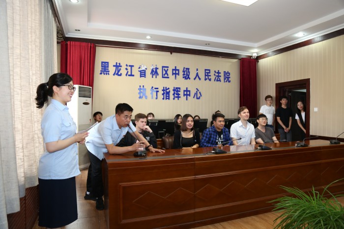 “我家大门常打开,开放怀抱等你……”6月20日,黑龙江省林区中级人民法院迎来了一群远道而来的客人,他们是来自哈尔滨理工大学国际文化教育学院的留学生。今天,他们在老师的带领下来到林区中院,亲身体验中国特色社会主义法治建设成果。