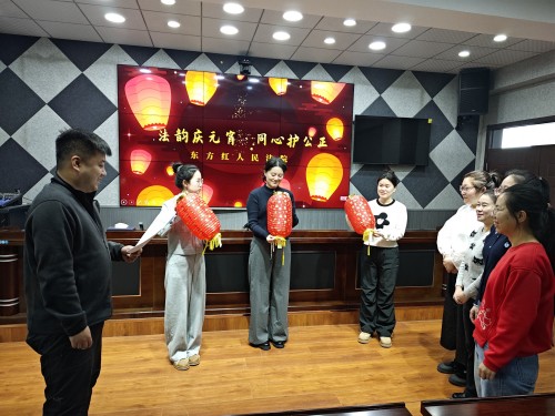 东方红法院开展“法韵庆元宵·同心护公正”猜灯谜活动。活动精选数十条灯谜,将立案、刑事、民事、执行等审判实务要点融入传统民俗,兼具知识性与趣味性。现场红灯笼映衬着谜条,干警们踊跃参与,在主持人的适时提示下,驻足凝思、热烈研讨。大家在轻松愉悦的氛围中巩固法律知识、增进协作默契,进一步激发了学习热情与思辨能力。